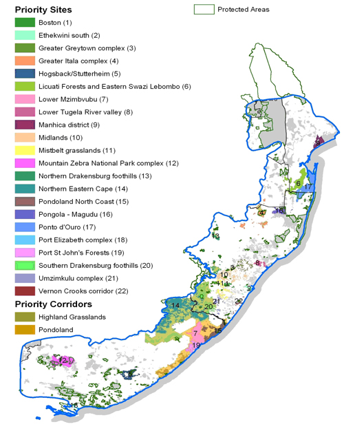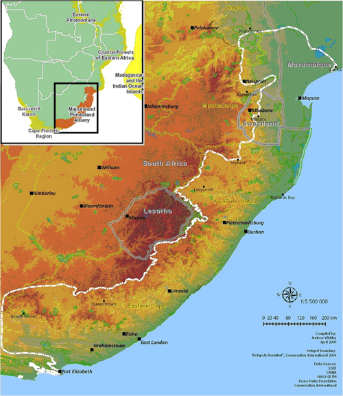 The Maputaland-Pondoland-Albany Biodiversity Hotspot, located along the east coast of southern Africa, below the Great Escarpment, is the second richest floristic region in southern Africa (after the Cape Floristic Region). Some 1,900 endemic plant species are found here, of which 534 are classified as either Vulnerable, Endangered or Critically Endangered per the IUCN Red List of Threatened Species.